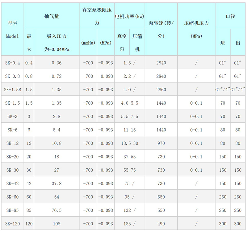 SK系列水环式真空泵及压缩机是用来抽吸或压缩空气和其它无腐蚀性、不溶于水、不含固体颗粒的气体,以便在密闭容器中形成真空和压力,吸入气体允许混入少量液体。